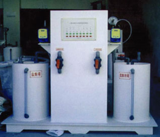該發生器由反應系統、吸收系統、原料供經系統和控制系統組成。工作時,含氯無機鹽與酸性活化劑被定量送到反應系統內,在一定的條件下,反應生成CLO2氣體,經吸收系統后形成一定濃度的CLO2消毒溶液,然后直接投加到待處理的水中。